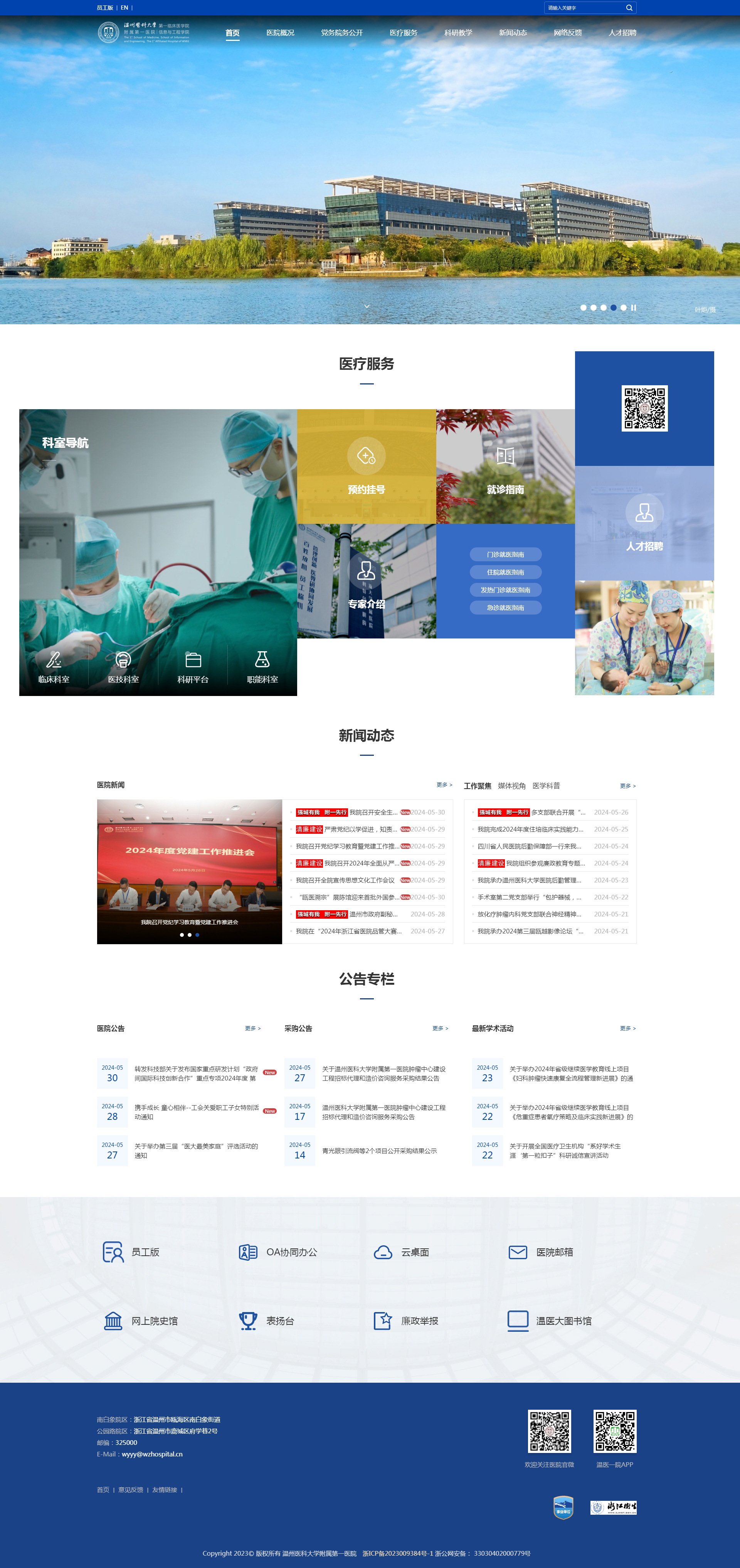 溫州醫科大學附屬第一醫院創建于1919年,是浙江省首批通過三甲評審的四家綜合性醫院之一,醫療服務輻射浙南閩北贛東近3000萬人口。醫院位列中國醫院科技影響力排行榜(綜合)第59位,25個學科入圍全國學科科技影響力百強。2021年獲批浙江省級區域醫療中心依托醫院。醫院現有在崗職工6593人,其中高級職稱908人、碩士生導師404人、博士生導師68人。擁有百千萬人才工程國家級人選、國家有突出貢獻中青年專家等各類人才近500人次。醫院南白象和公園路兩個院區占地總面積530余畝,建筑面積43萬平方米,核定床位33