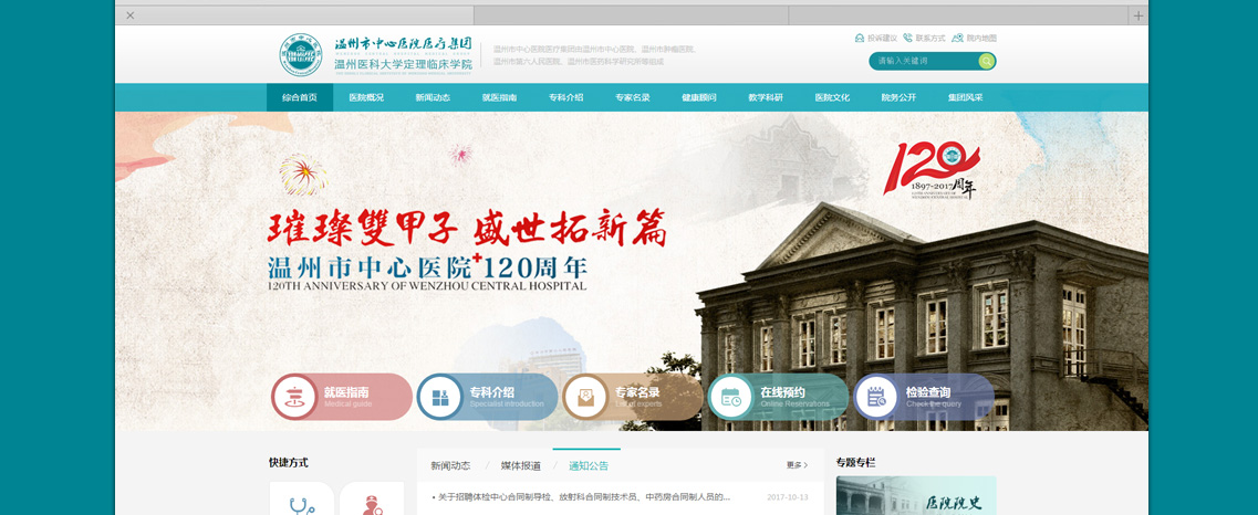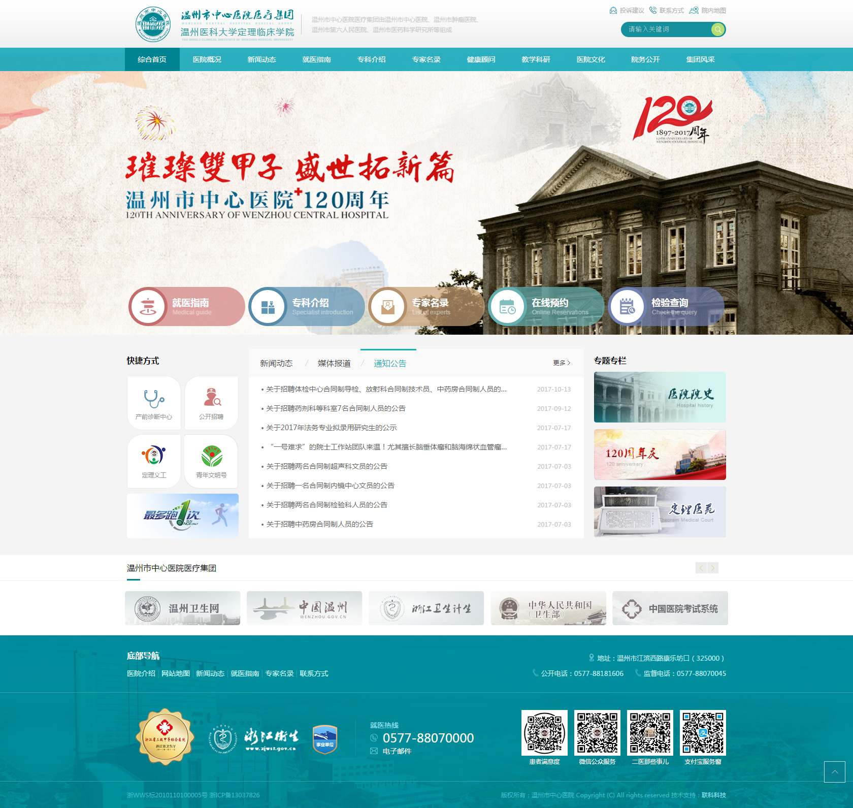 溫州市中心醫(yī)院(溫州市腫瘤醫(yī)院、溫州市醫(yī)藥科學(xué)研究所)坐落在美麗的甌江之濱,是一所集醫(yī)療、教學(xué)、科研、預(yù)防、保健、康復(fù)為一體的三級甲等綜合醫(yī)院,是浙江三家百年名院之一。醫(yī)院始建于1897年(清光緒23年),前身是定理醫(yī)院、白累德醫(yī)院、溫州市第二人民醫(yī)院。2002年—2003年,醫(yī)院先后和溫州市醫(yī)藥科學(xué)研究所、溫州市第五人民醫(yī)院、溫州市腫瘤醫(yī)院資產(chǎn)重組合并,成為三院一所格局的醫(yī)療集團;2008年成為溫州醫(yī)科大學(xué)附屬醫(yī)院——定理臨床學(xué)院;2012年晉級三級甲等綜合醫(yī)院,更名為溫州市中心醫(yī)院;2015年成立溫州