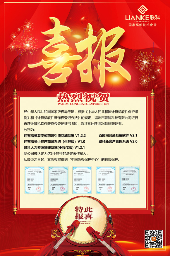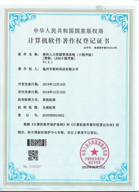 《聯(lián)科人力資源管理系統(tǒng)(小程序版)V1.2.1》于2010年06月15日被正式授予《中華人民共和國國家版權(quán)局計算機軟件著作權(quán)登記證書》,登記號為2020SR0624822。