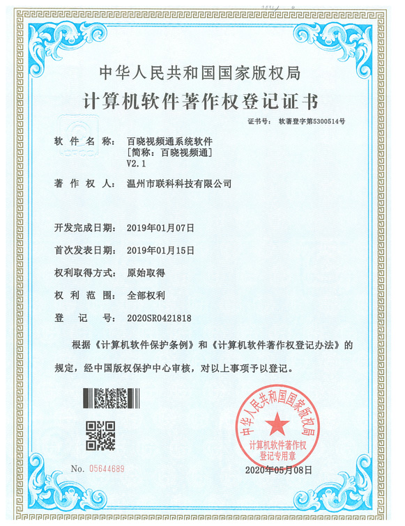《百曉視頻通系統(tǒng)軟件V2.1》于2020年05月08日被正式授予《中華人民共和國國家版權(quán)局計算機軟件著作權(quán)登記證書》,登記號為2020SR0421818。