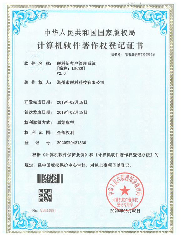 《聯(lián)科新客戶管理系統(tǒng)V2.0》于2020年05月08日被正式授予《中華人民共和國國家版權(quán)局計算機軟件著作權(quán)登記證書》,登記號為2020SR0421830。