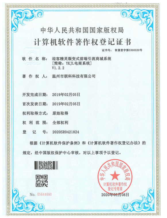 《迎客精靈裂變式前端引流商城系統(tǒng)V1.2.2》于2020年05月08日被正式授予《中華人民共和國國家版權(quán)局計算機軟件著作權(quán)登記證書》,登記號為2020SR0421824。
