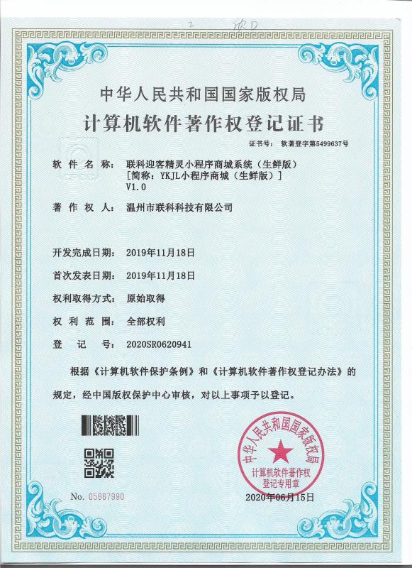 《聯(lián)科迎客精靈小程序商城系統(tǒng)(生鮮版)V1.0》于2020年06月15日被正式授予《中華人民共和國國家版權(quán)局計算機軟件著作權(quán)登記證書》,登記號為2020SR0620941。