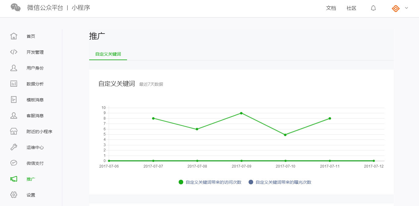 可在小程序后臺的 “推廣” 模塊中,查看通過自定義關鍵詞帶來的訪問次數。