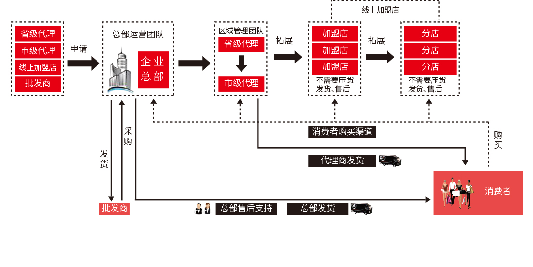 讓代理商、員工及親友、顧客在平臺(tái)上一起開(kāi)設(shè)該企業(yè)的線上連鎖加盟店。